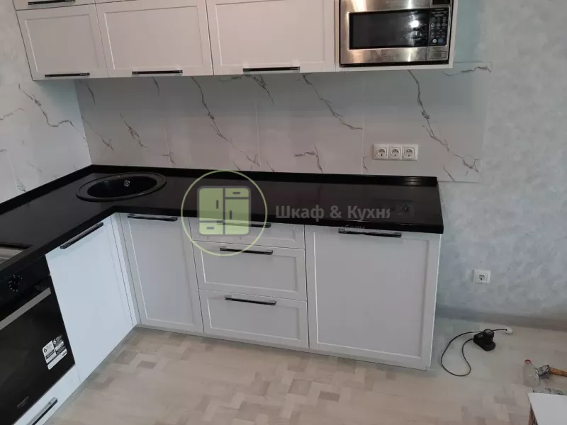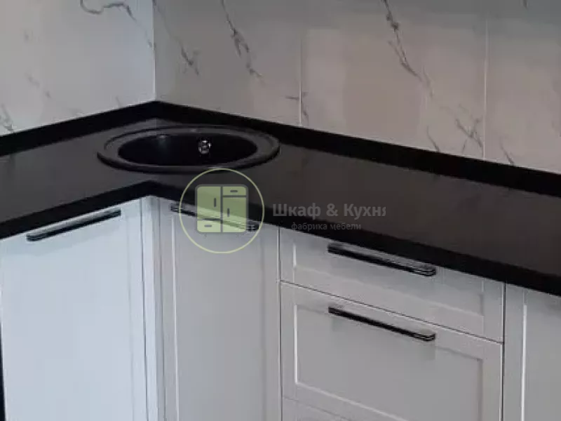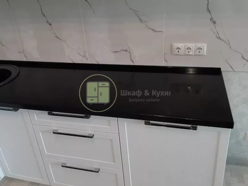 Представляем стильную угловую столешницу из искусственного акрилового камня, идеально подходящую для современной кухни . Элегантная чёрная глянцевая поверхность гармонично сочетается с белыми фасадами кухонных шкафов, создавая выразительный контраст
