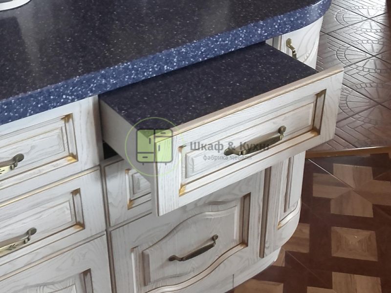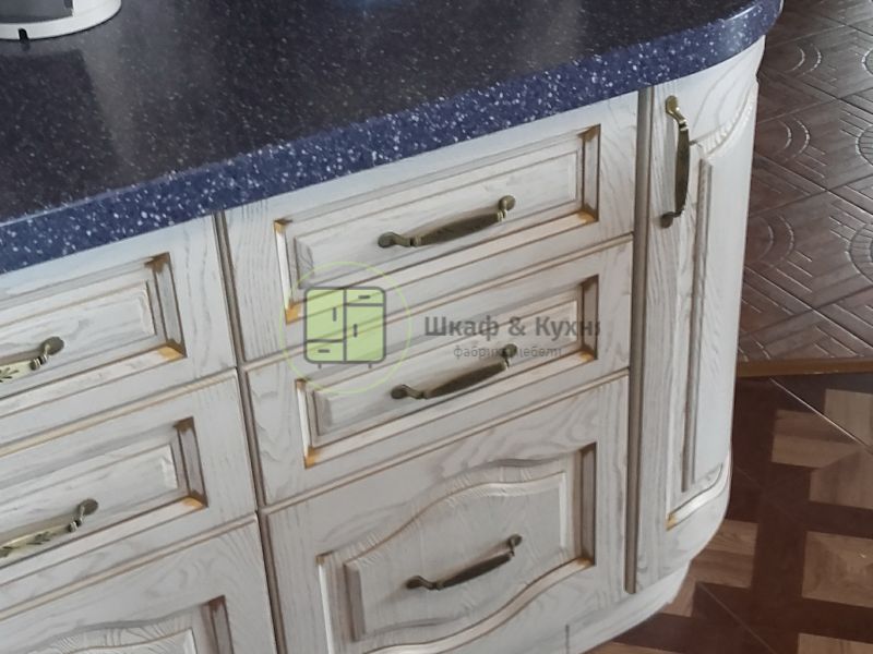 Превратите свою кухню в произведение искусства! Представляем эксклюзивную кухонную композицию: фасады из массива дуба с изысканной золотой патиной, столешница из искусственного камня, завораживающие витражи и стильная барная стойка. Элегантность, роскошь и функциональность в каждой детали — для тех, кто ценит утончённый дизайн и практичность.
