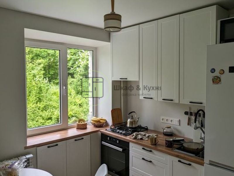 Решение: Расширенная столешница и умная интеграция. Подоконник становится частью столешницы, создавая непрерывную линию для готовки. Вся техника (варочная панель, духовка, микроволновка, холодильник) либо встроена, либо подобрана в одном цвете с фасадами, освобождая пол и столешницу. Микроволновка размещена на верхнем шкафу — неожиданно, но эргономично.
